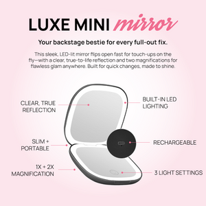Light up your glam. Anytime. Anywhere. This isn’t your average compact — the Luxi Mini Mirror brings LED-powered glow wherever you go. Perfect for touch-ups in bad lighting (aka every competition bathroom), this rechargeable mirror lights up your face with soft, even brightness so you can perfect your lashes, liner,...